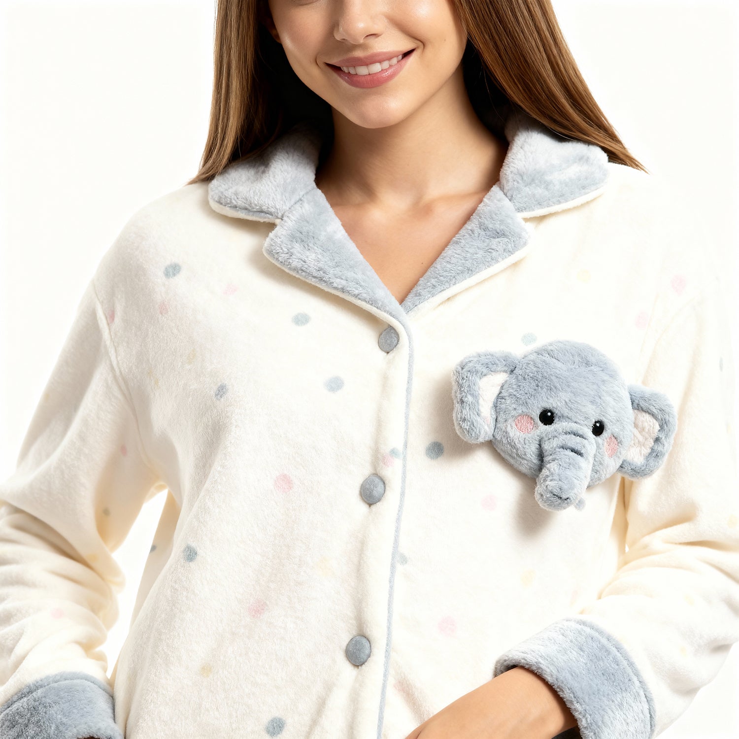 البيچ × الرمادي الفاتح: خامة كريمية مزينة بنقط صغيرة بألوان هادئة (رمادي، روز، وسماوي)، مع ياقات وكُفات رمادية ناعمة بلون موحّد يبرز التصميم.