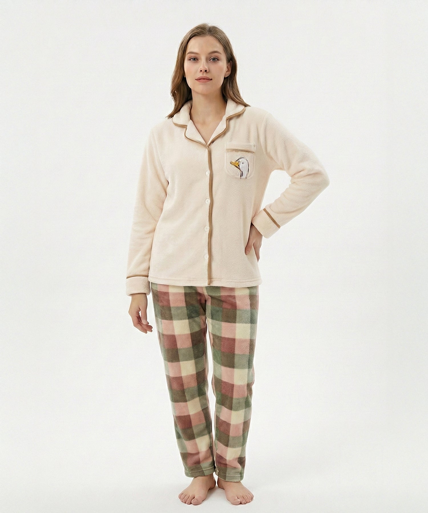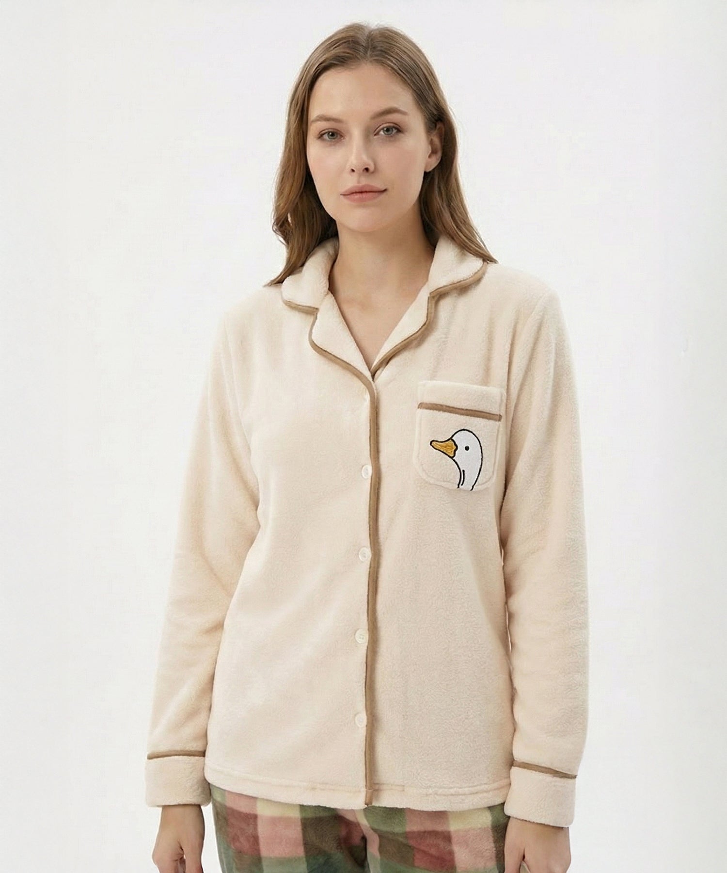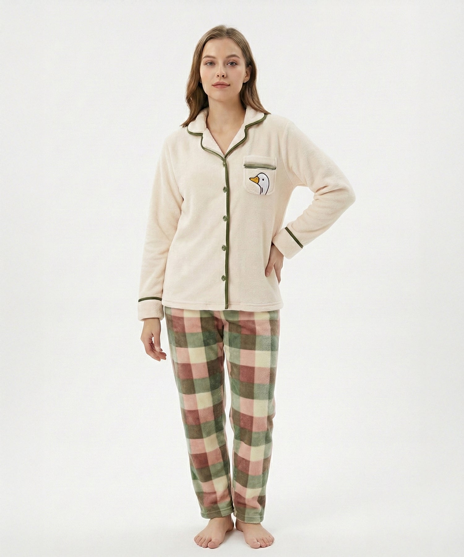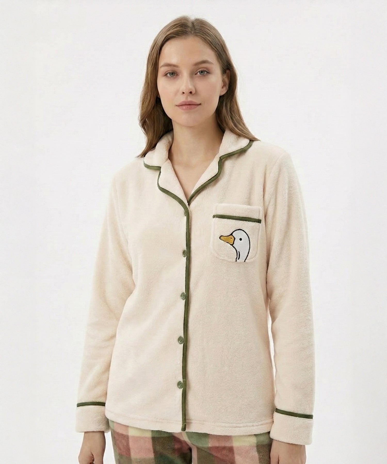 البيچامة تأتي بلون كريمي هادئ بلمسة شتوية أنثوية.