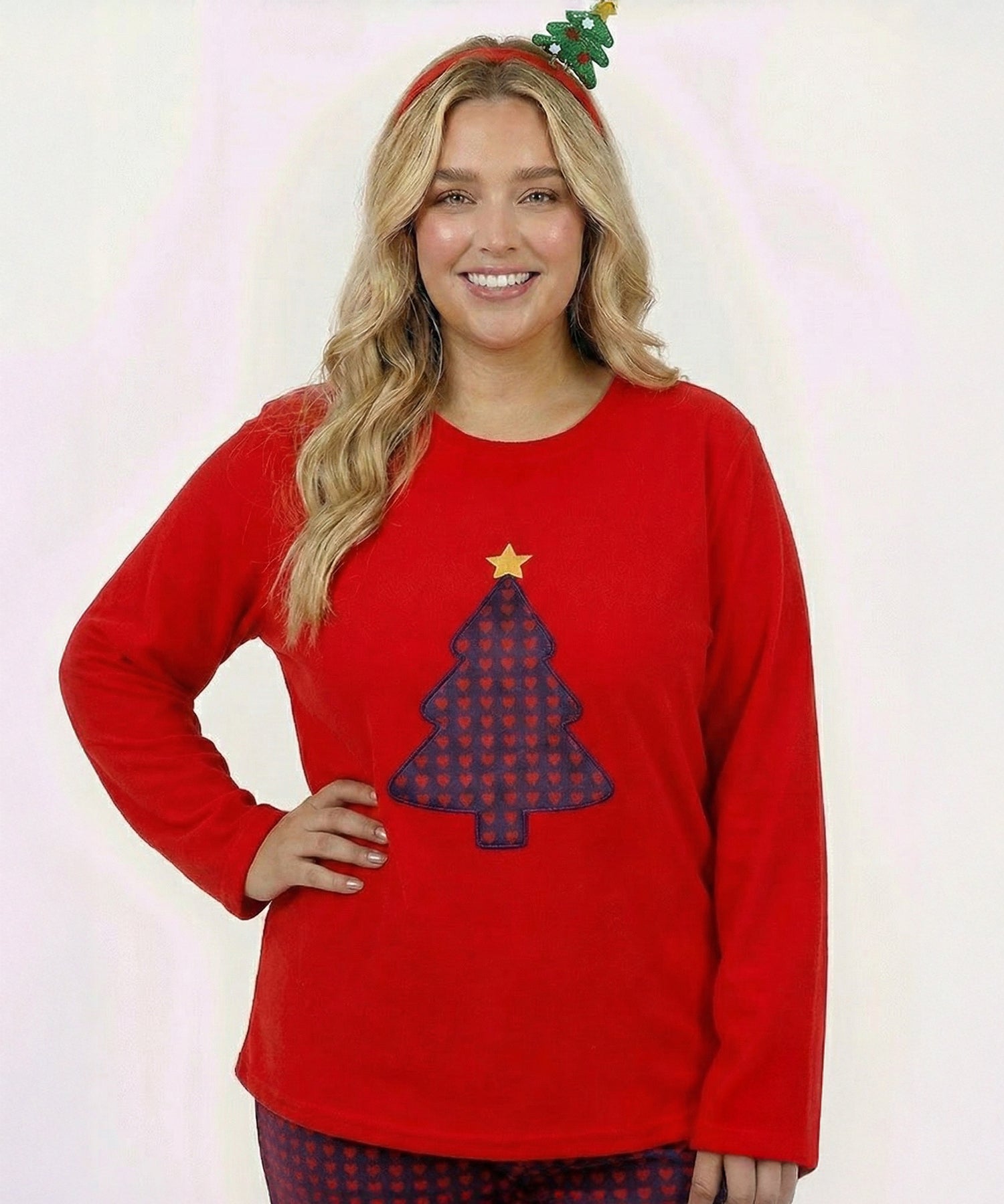 تطريز بارز لشجرة عيد الميلاد على الصدر مع نجمة ذهبية صغيرة تعطي لمسة جميلة وواضحة.