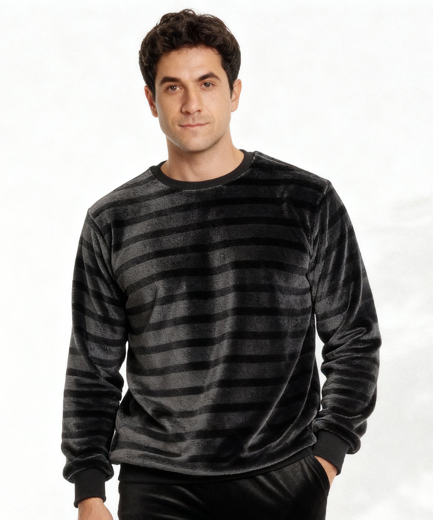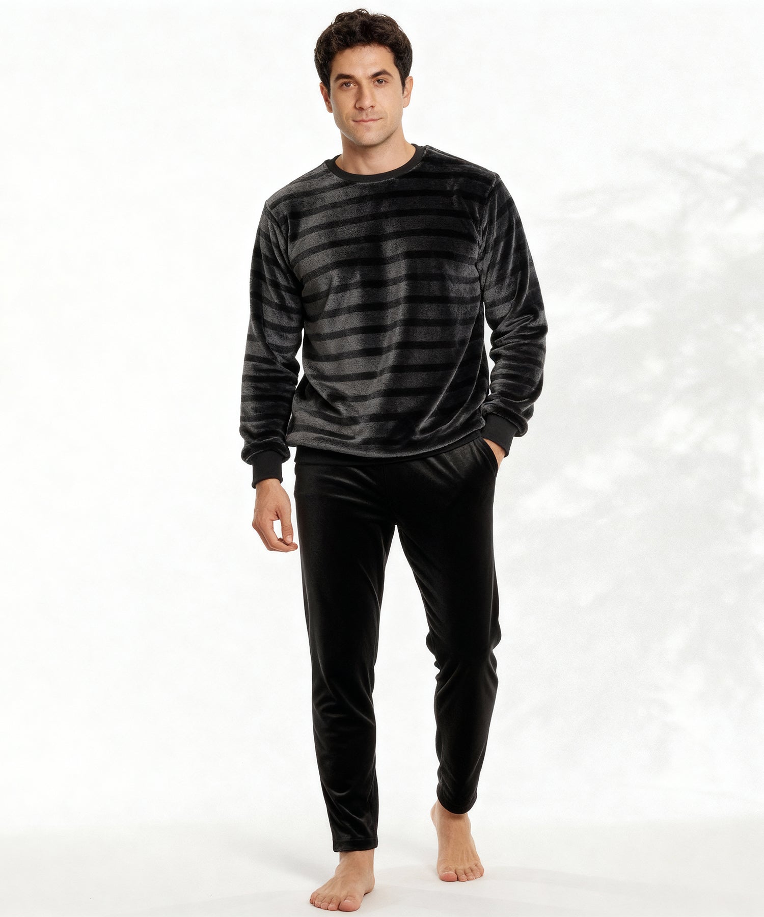 بيچامة رجالي شتوي قطيفة هايدي مستورد – رمادي غامق بخطوط سوداء
