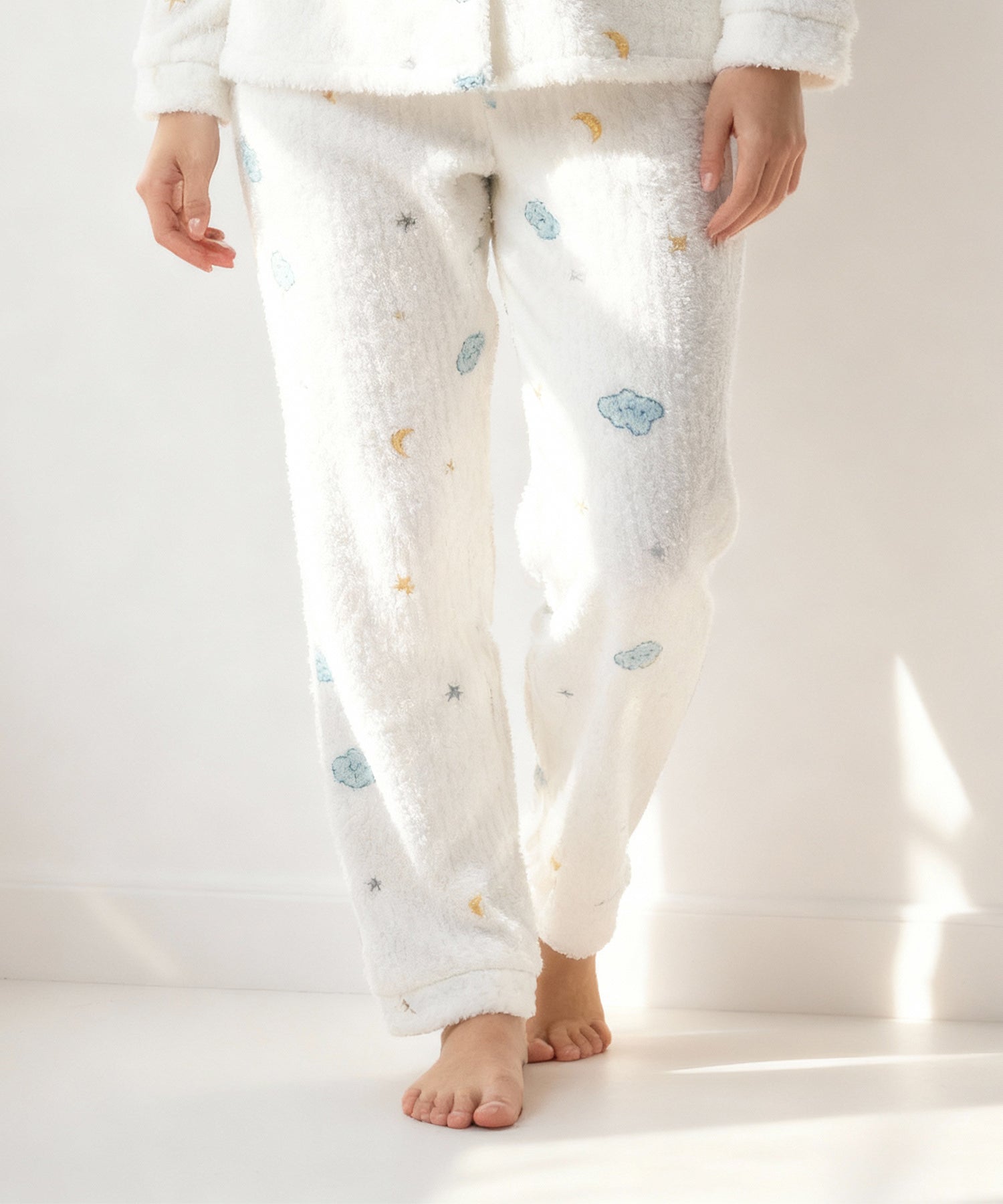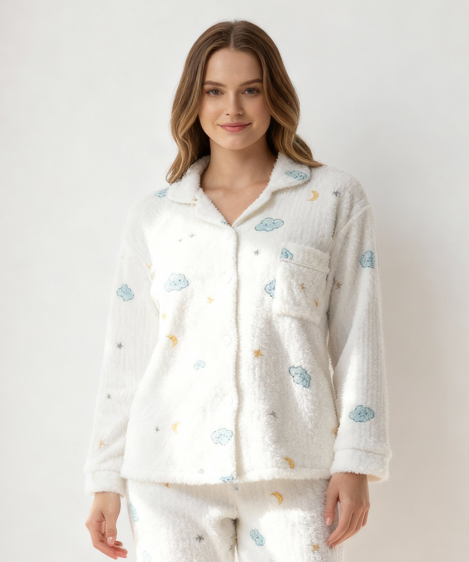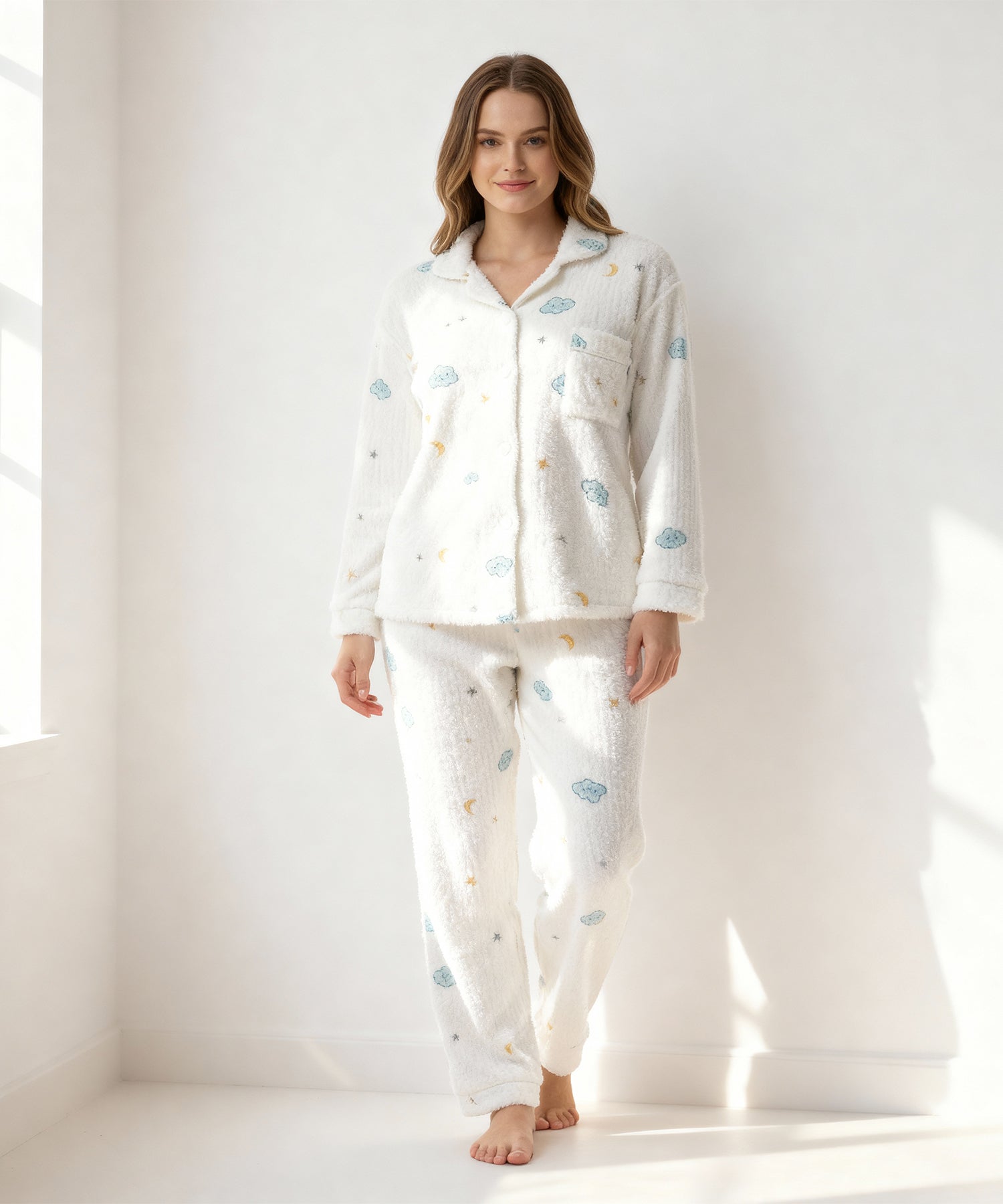 البيچامة تأتي بلون أوف وايت كريمي ناعم مطبوع عليه رسومات سحب زرقاء، نجوم وأهلة ذهبية بتوزيع متناسق على القماش بالكامل.