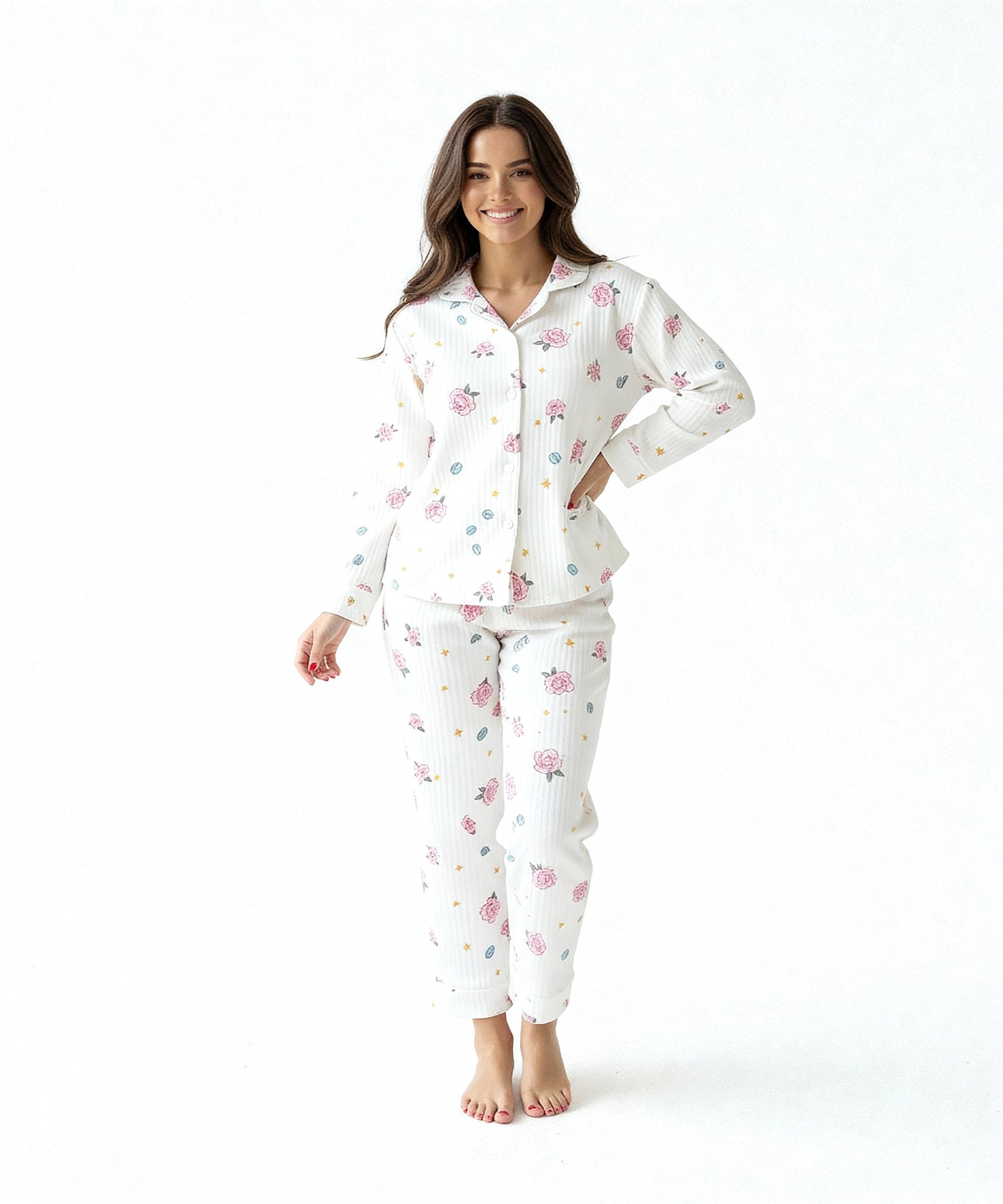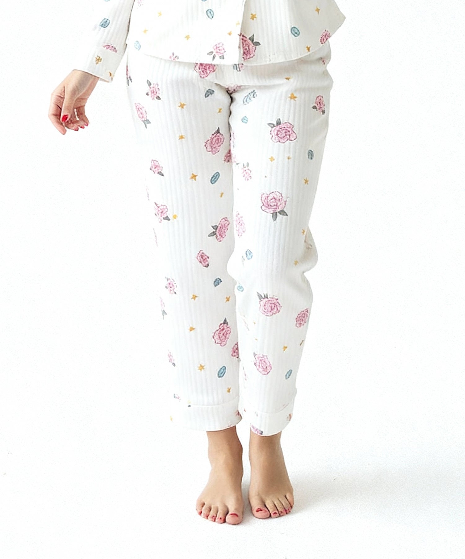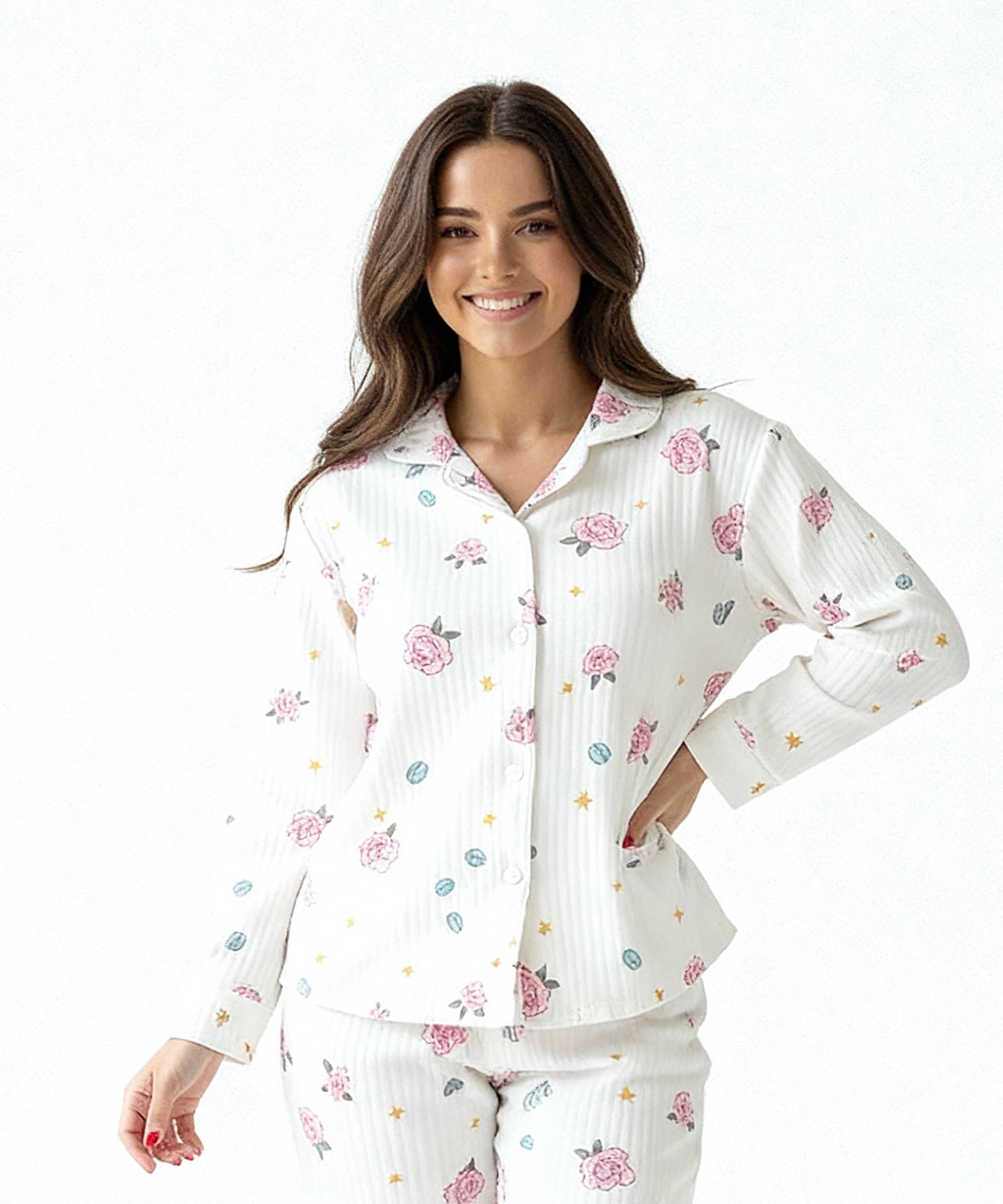 البيچامة تأتي بلون أوف وايت فاتح مزين بنقوش ورود وردية صغيرة متداخلة مع نجوم ذهبية ولمسات رمادية ناعمة.