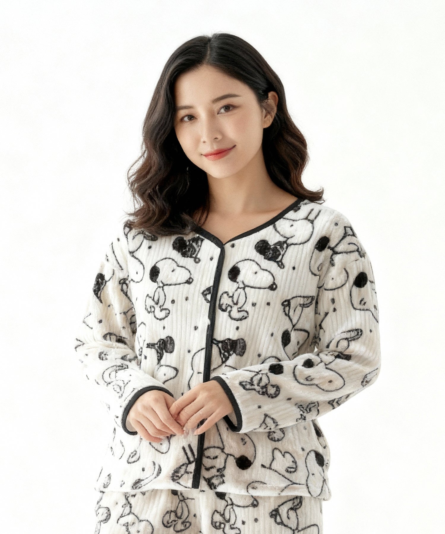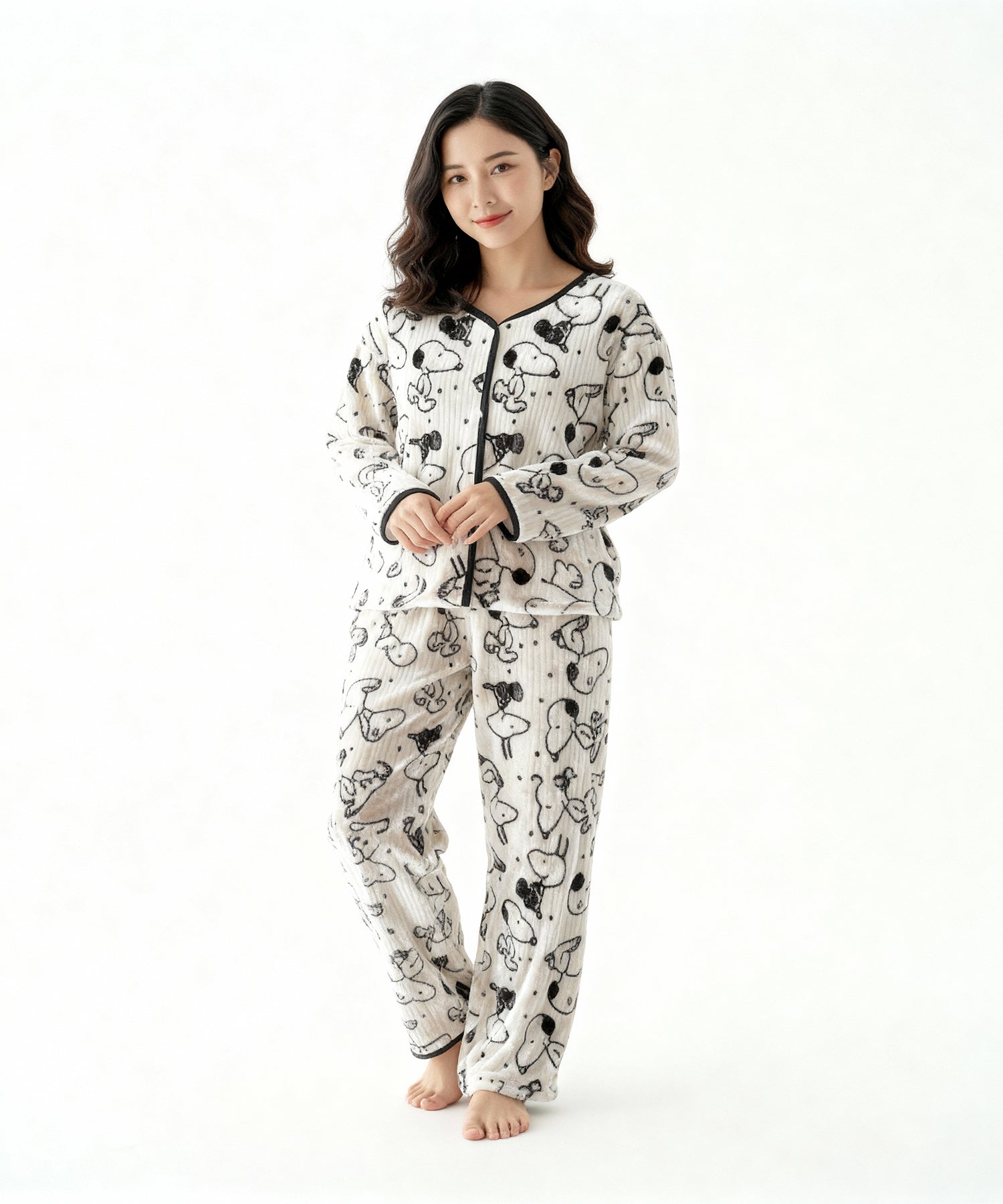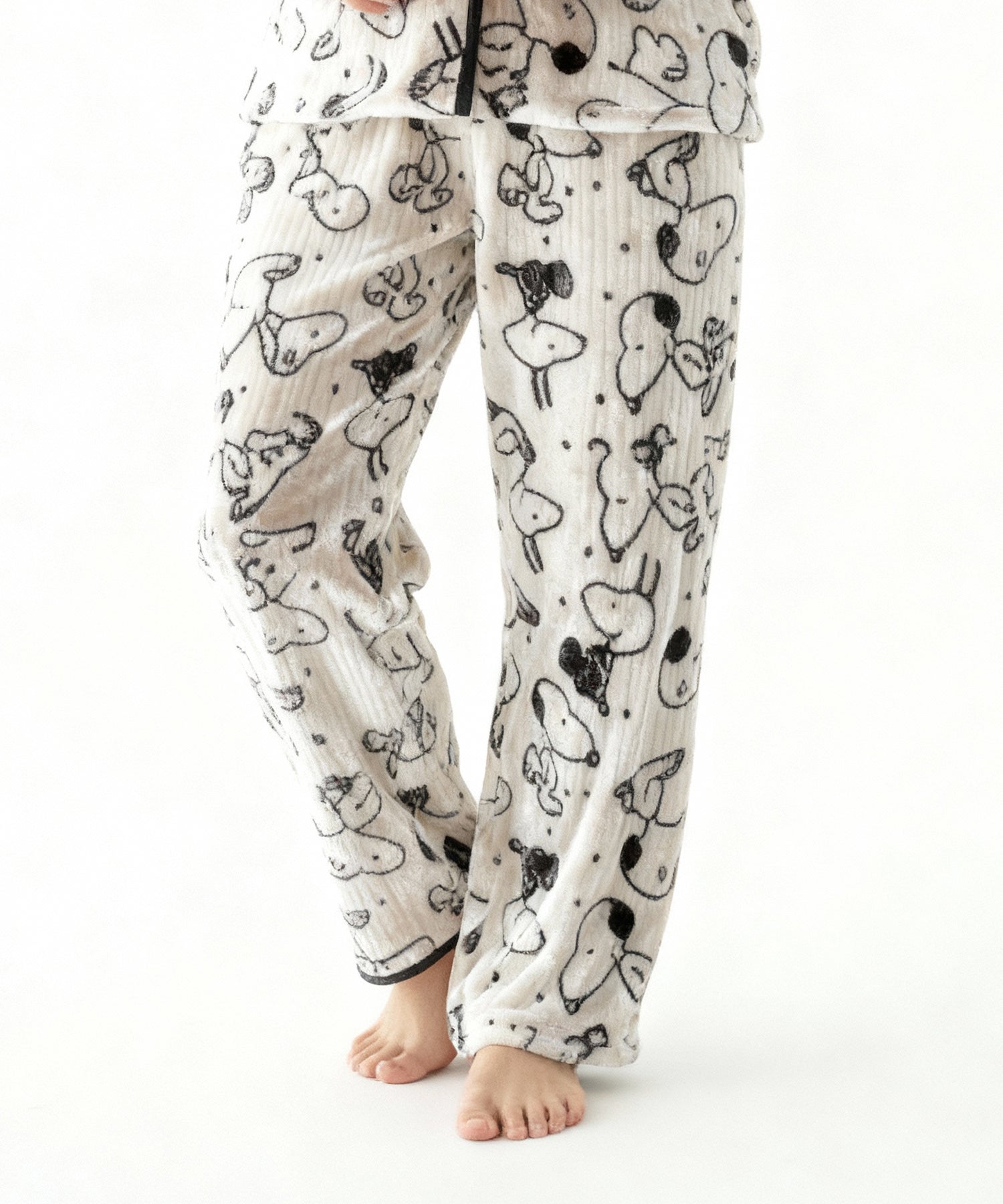 • أبيض × أسود: بلوزة وبنطلون بنقشة كلاب سـنـوبـي بالأبيض والأسود مع حواف باللون الأسود الأنيق.