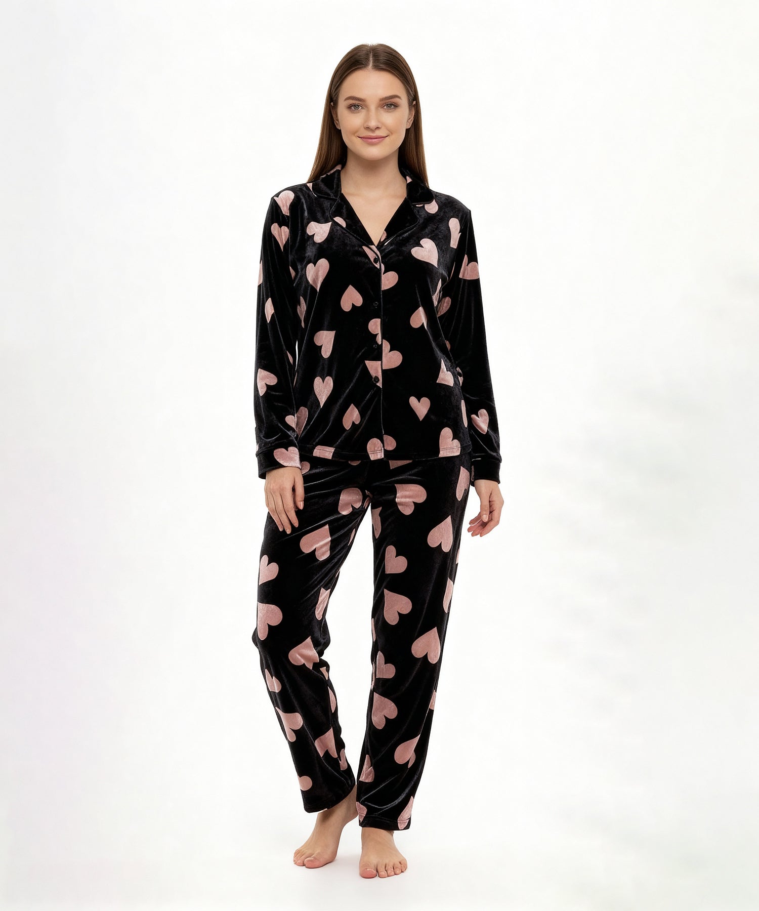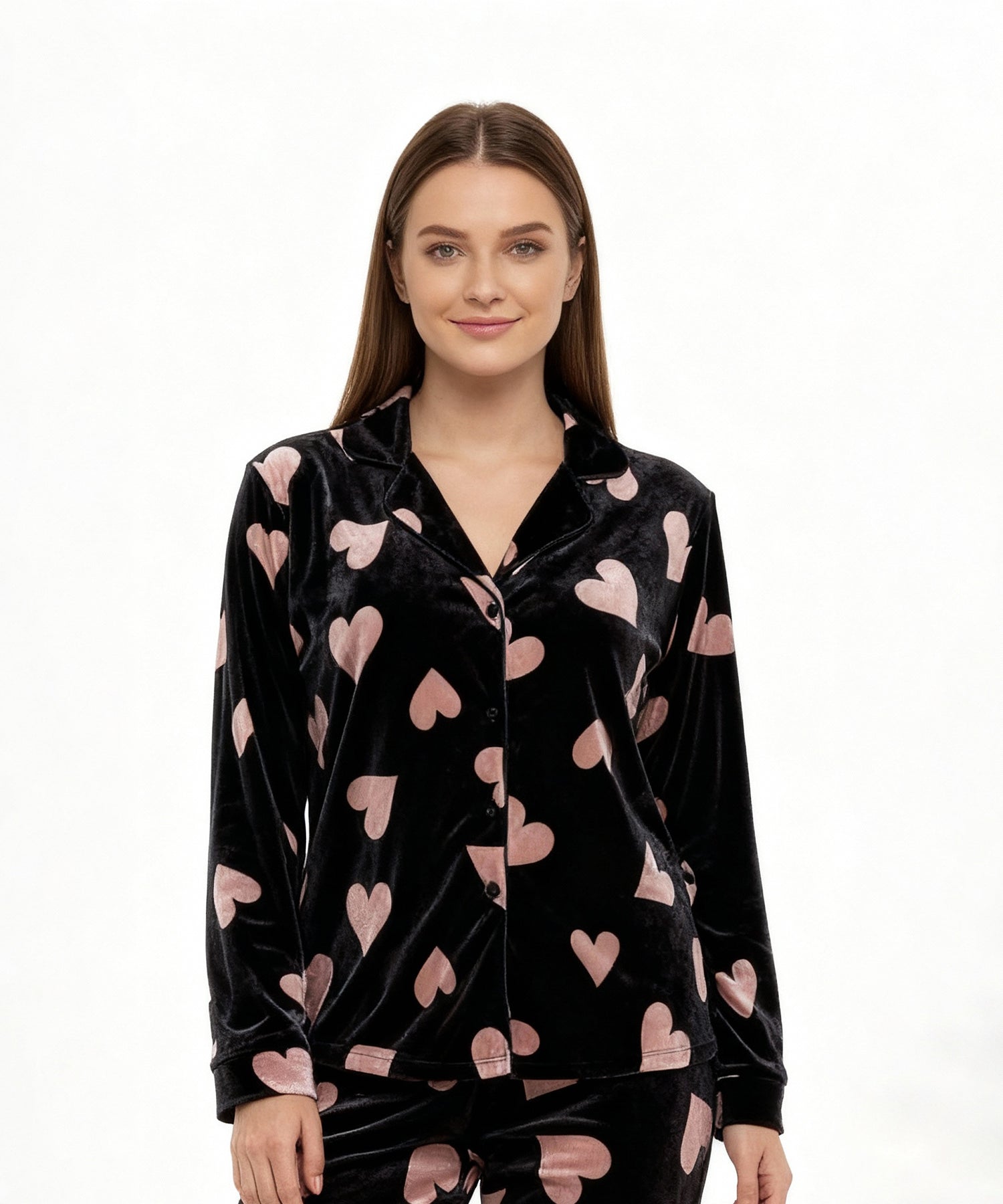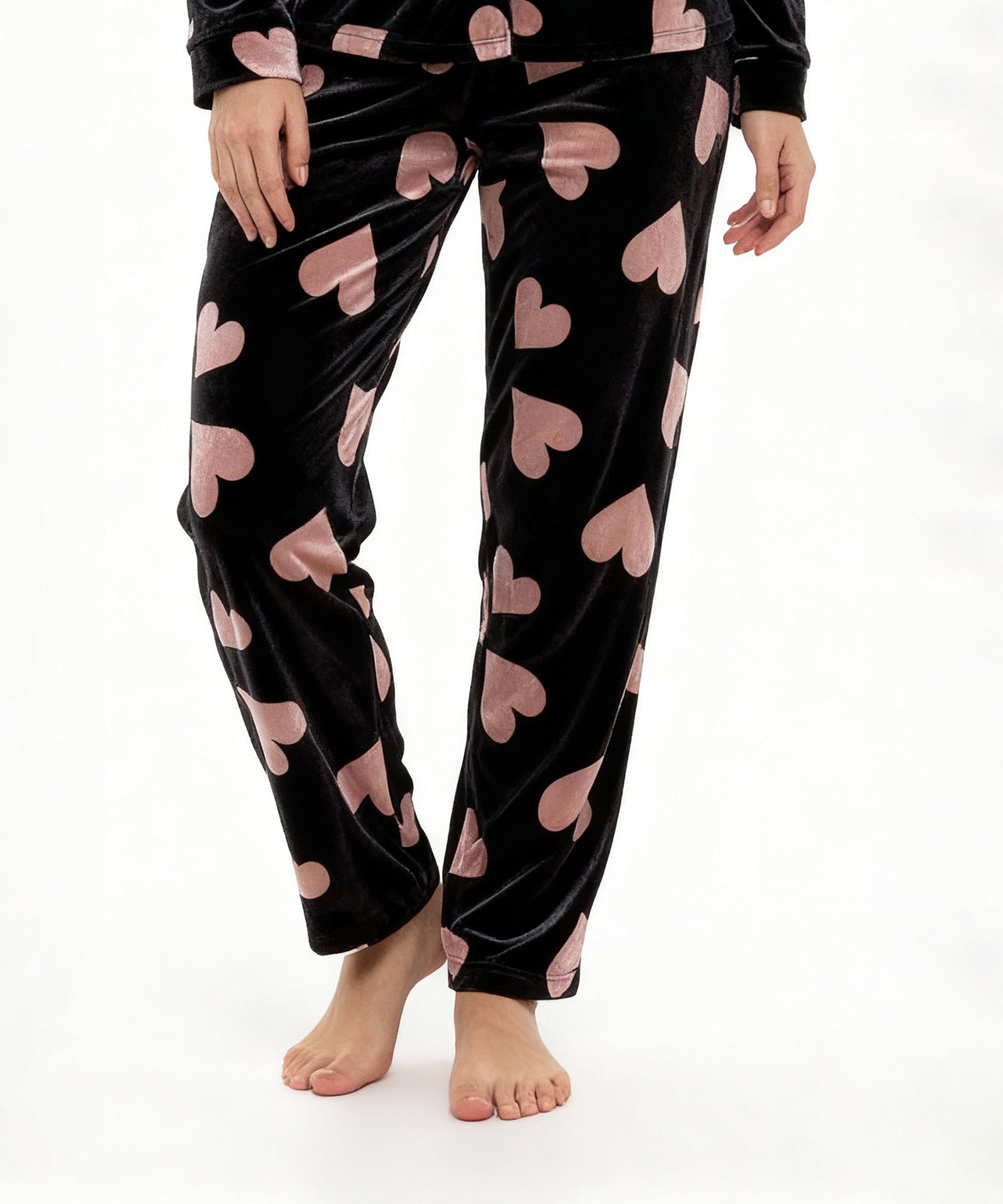 أسود × بينك: بلوزة وبنطلون باللون الأسود الغامق مزينين بنقشة قلوب كبيرة باللون البينك الفاتح، بتصميم جذّاب وأنثوي.