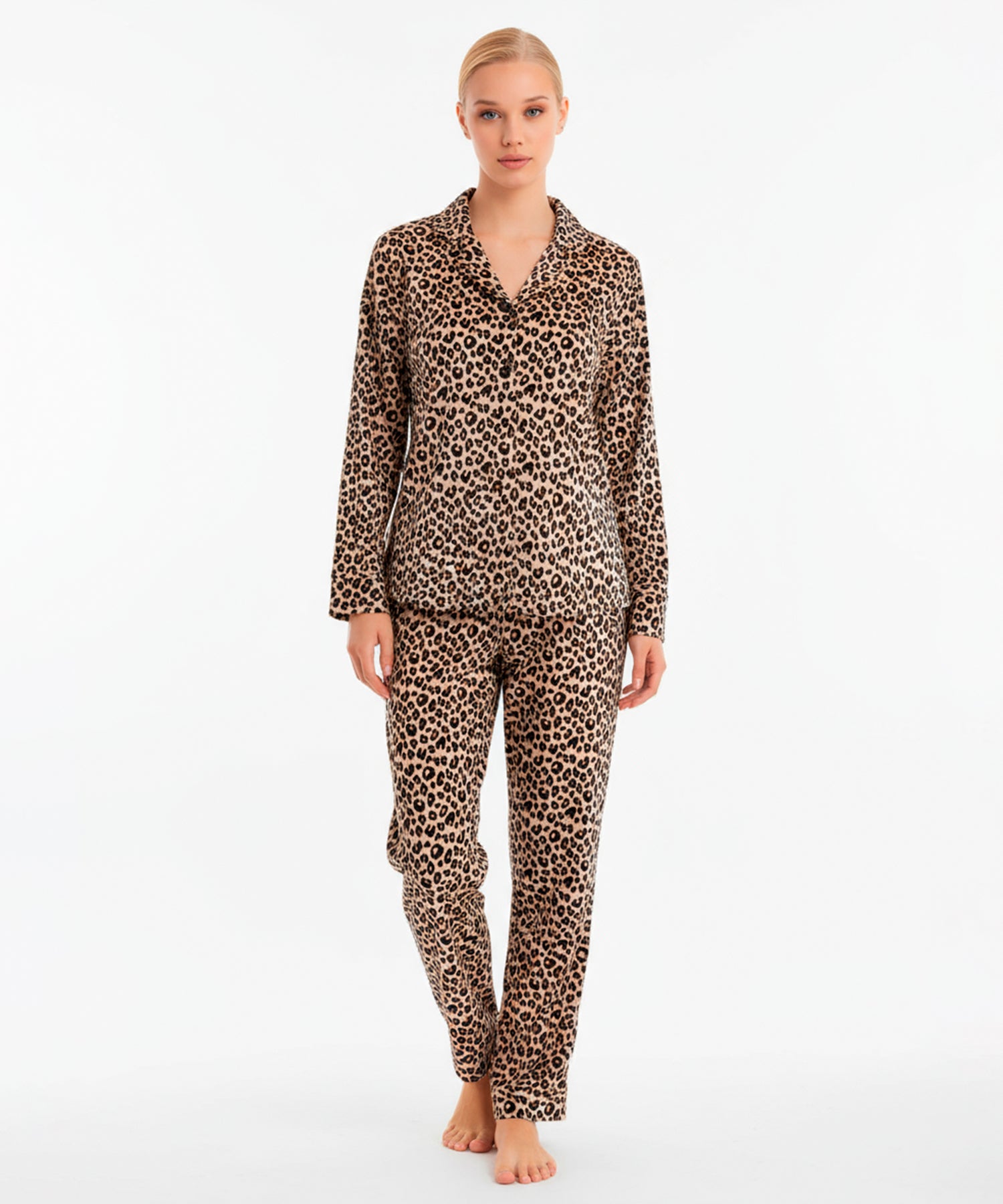 ليوبارد: بلوزة وبنطلون بنقشة جلد الفهد الكلاسيكية بدرجات البيچ × البني × الأسود، بتصميم عصري جريء وأنيق.