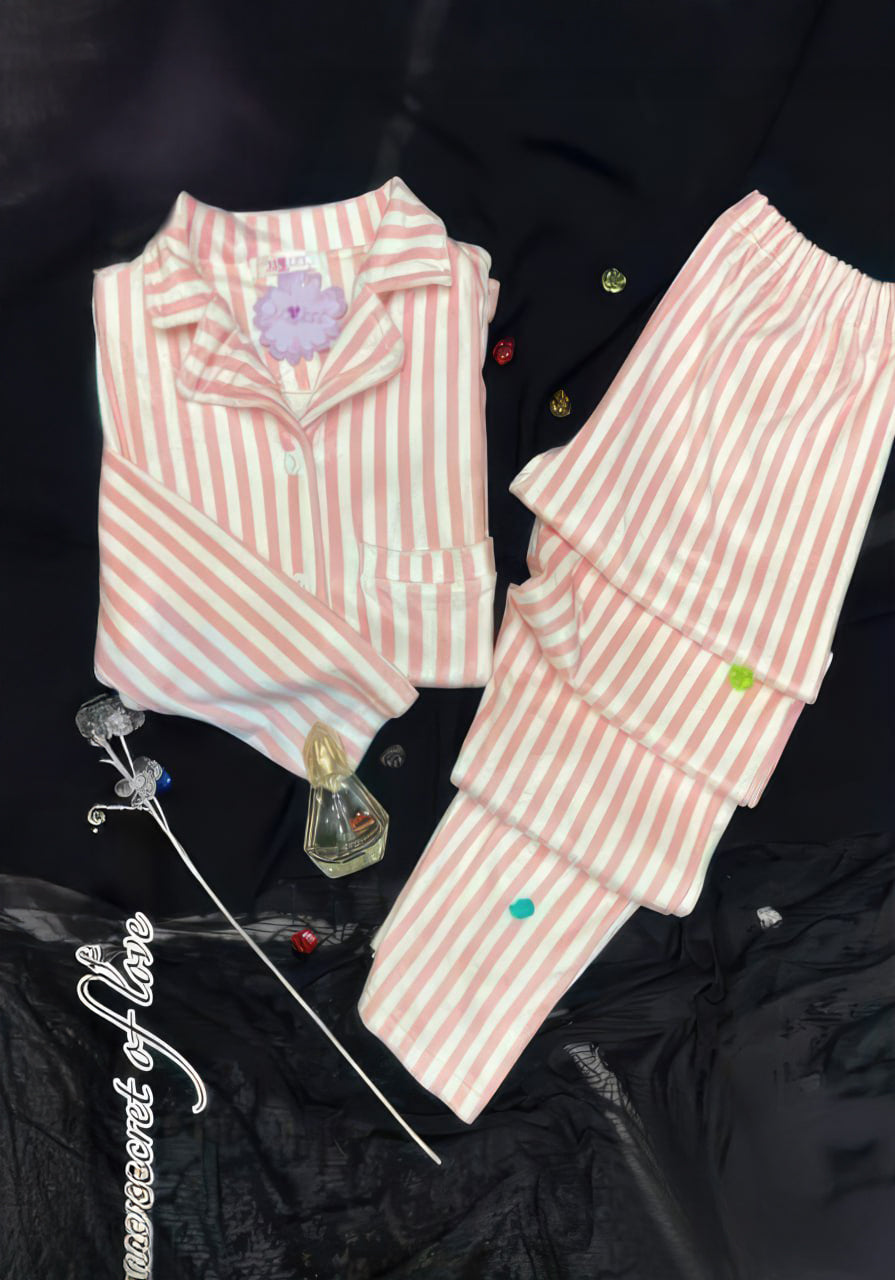 روز فاتح × أبيض: بلوزة بأزرار أمامية كاملة بتصميم خطوط طولية ناعمة بنفس درجة البنطلون الروز السادة، بتنسيق أنثوي مميز.