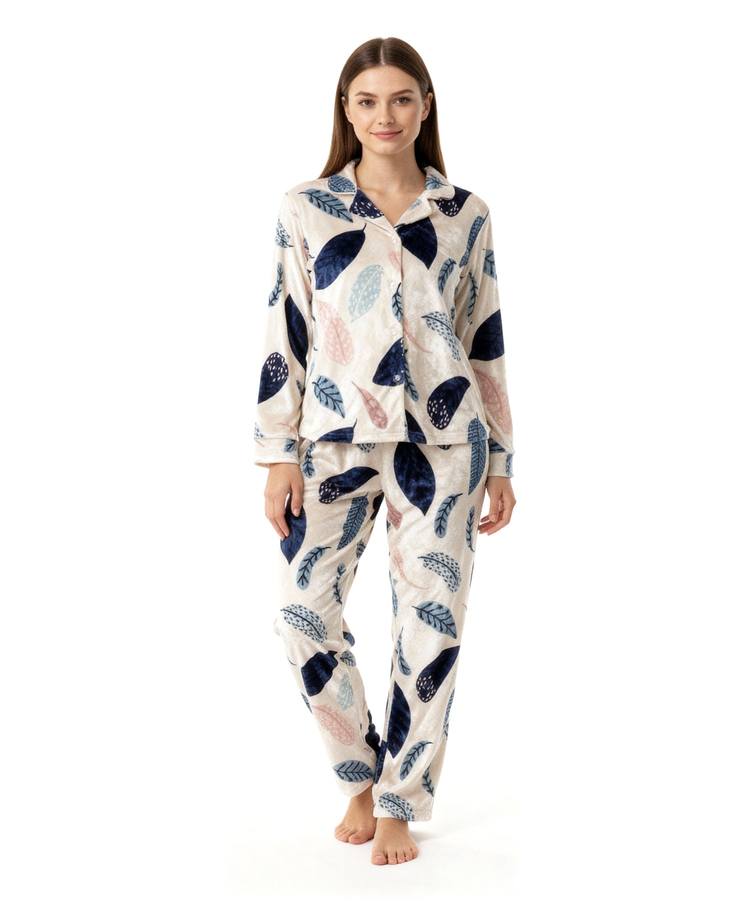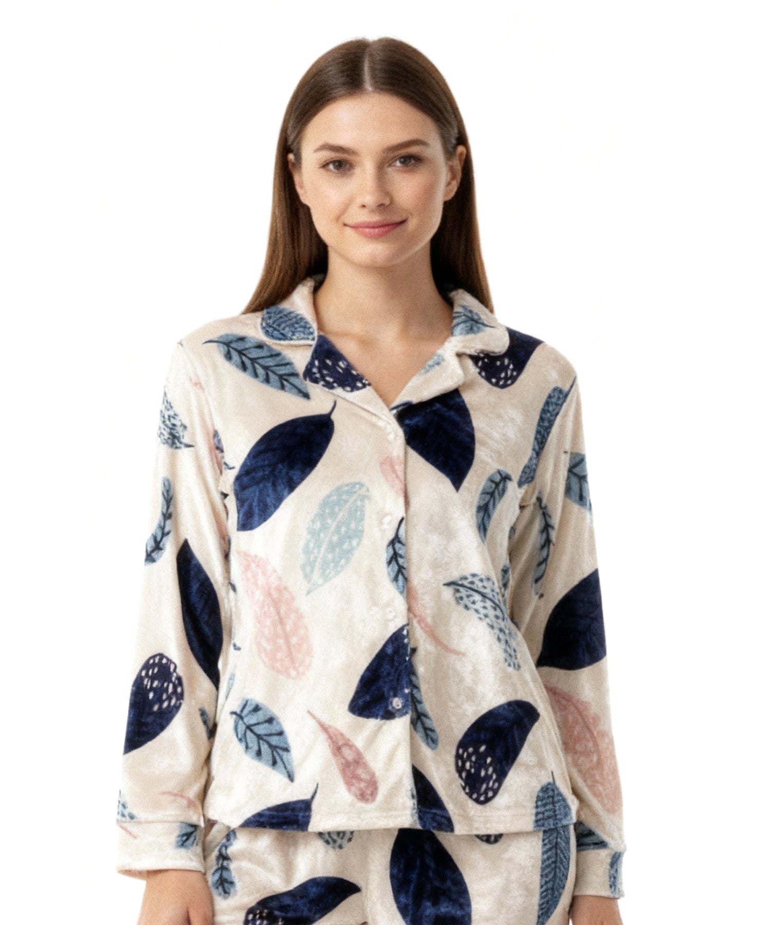 بيچ × أزرق × روز: بلوزة وبنطلون بنفس النقشة المستوحاة من أوراق الشجر بدرجات الأزرق الغامق والروز الفاتح والسماوي، لإطلالة ناعمة وعصرية.