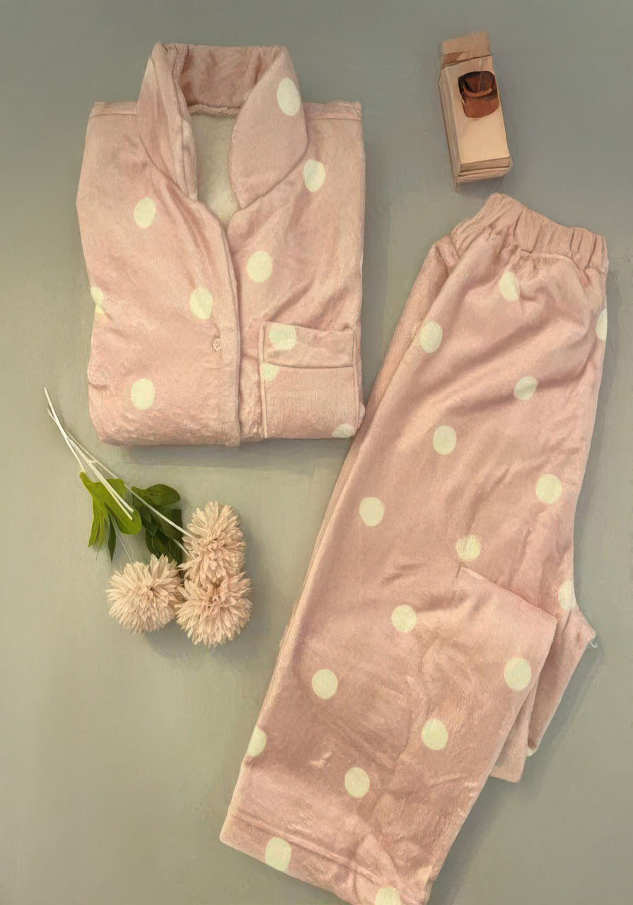 البيچامة بلون وردي فاتح مطبوع عليه نقاط بيضاء كبيرة (بولكا دوتس) بتصميم بسيط وأنثوي جدًا.