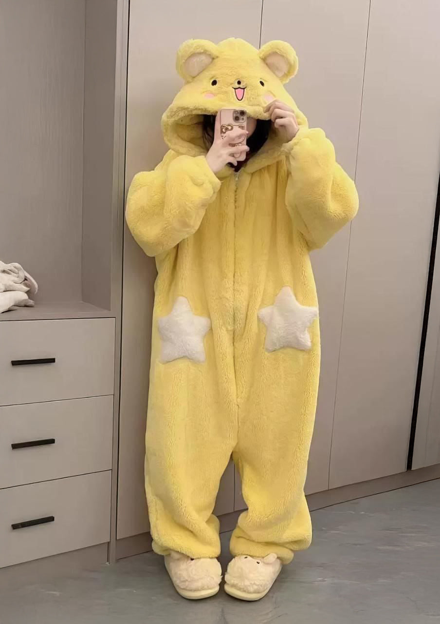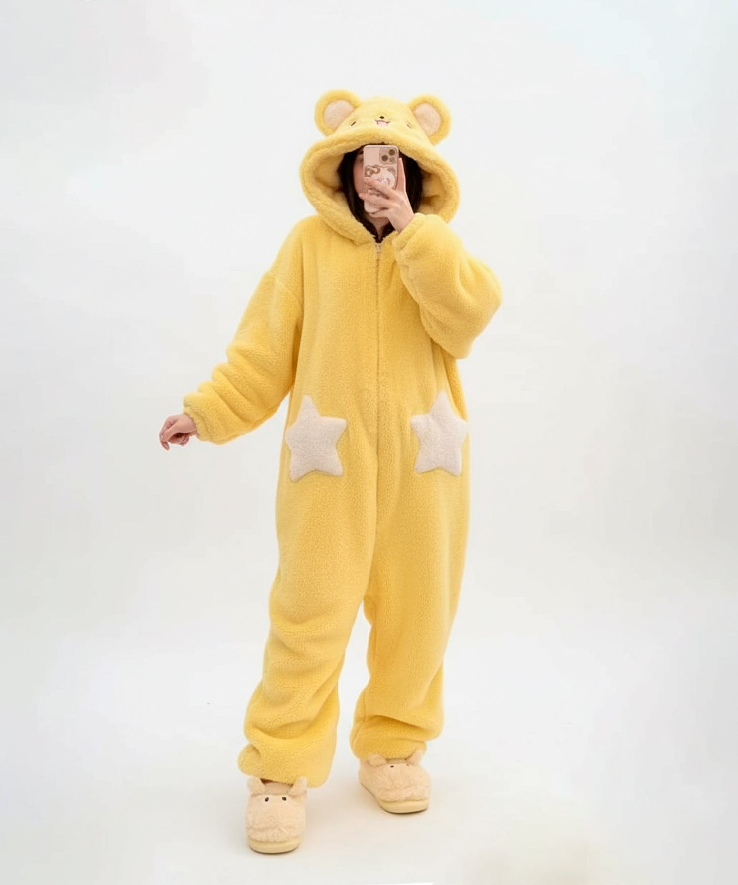 القطع: أوفرول كامل بغطاء رأس على شكل دبدوب