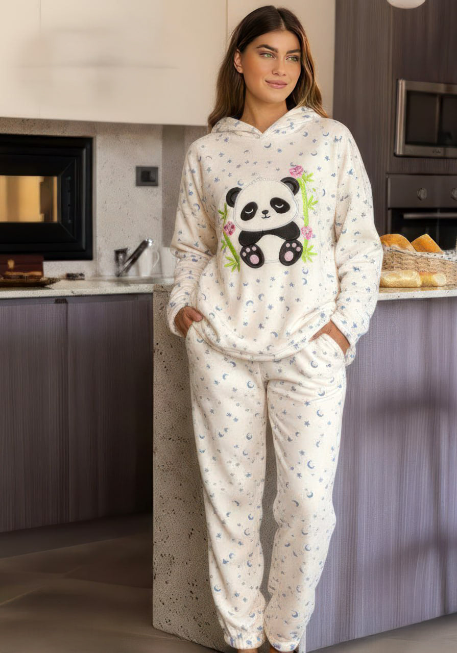 هودي أبيض مزين بتطريز باندا لطيف وسط فروع خضراء وزهور صغيرة، مع نقشات هادئة باللون الأزرق الفاتح.