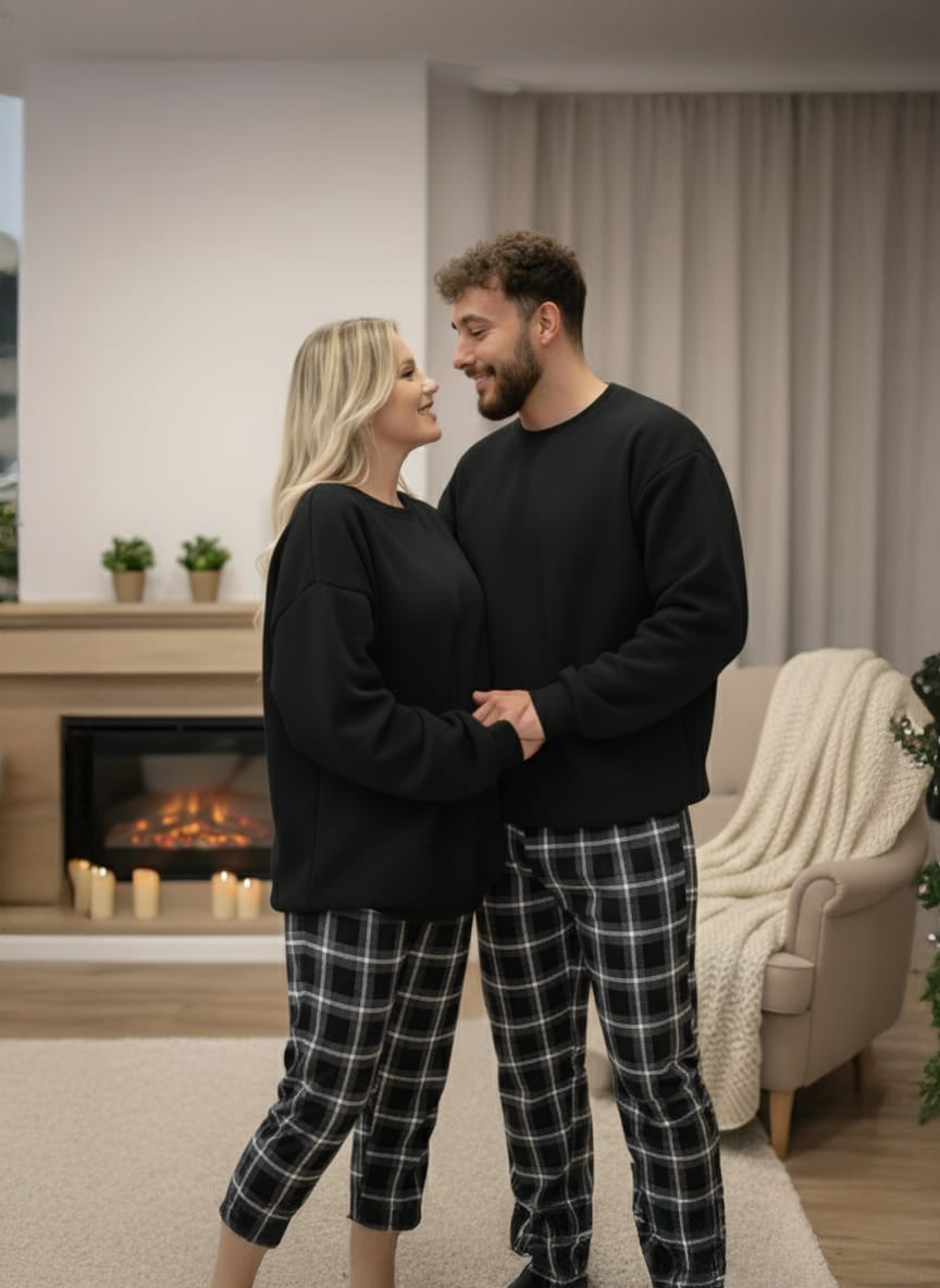 الطقم مكون من قطعتين (سويت شيرت + بنطلون كاروه).