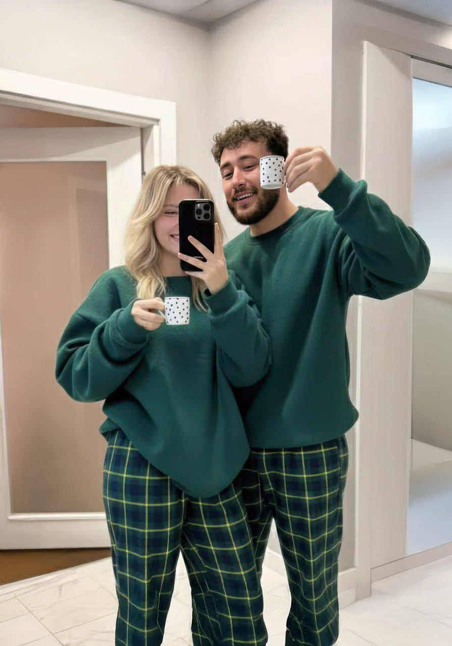 البنطلون بنقشة كاروه أنيقة بالألوان المتناسقة مع السويت شيرت، بخامة قطنية دافئة وخصر مطاطي مريح.