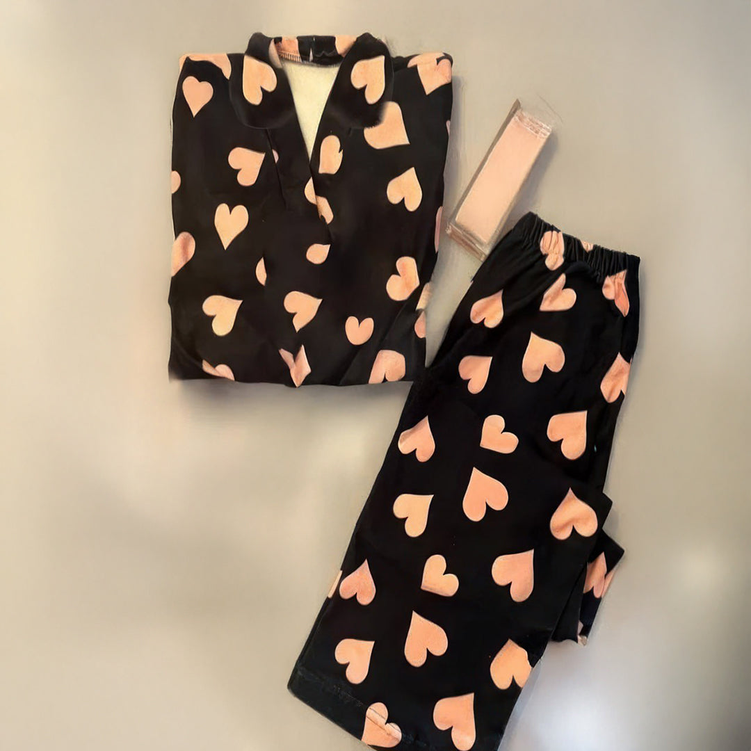 أسود × بينك: بلوزة وبنطلون باللون الأسود الغامق مزينين بنقشة قلوب كبيرة باللون البينك الفاتح، بتصميم جذّاب وأنثوي.