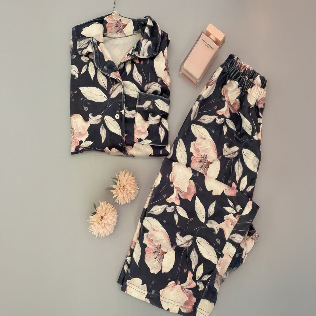 أسود × بيچ × بينك: بلوزة وبنطلون باللون الأسود مزينين بنقشة ورود كبيرة بدرجات البيچ والبنك الفاتح، تضيف لمسة راقية وأنثوية.
